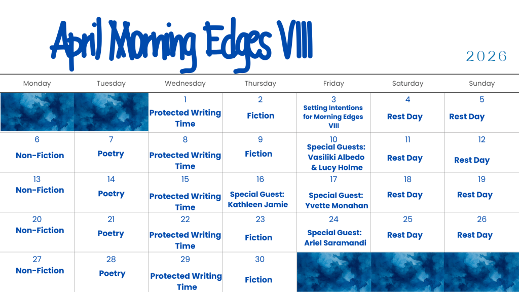 Morning Edges, now in its eighth season, is a community of creative writing practice. We will meet every weekday morning, 9am-10am, online in April to spend time with our writing and one another.
